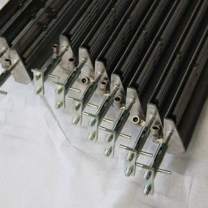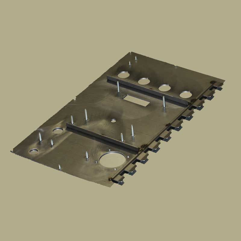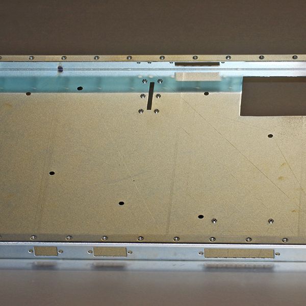 Rückseite des Bedienpanels: Es ist zur Befestigung der elektronischen Regelung des Antriebs mit Bolzen und Stegen versehen. Die Frontplatte wird lackiert und im Siebdruck-verfahren beschriftet.
