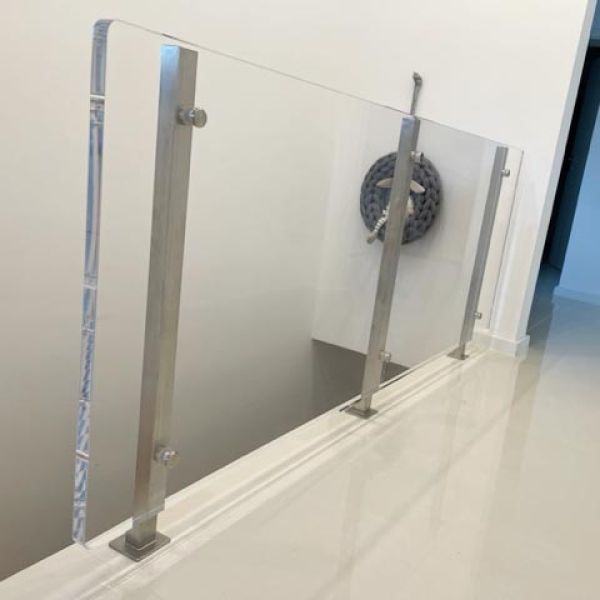 Ein Geländer zur Sicherung eines Treppenabganges. Die Pfosten sind aus Edelstahl nach Kundenwunsch gefertigt. Die Oberfläche ist gebürstet und elektrochemisch gebeizt.