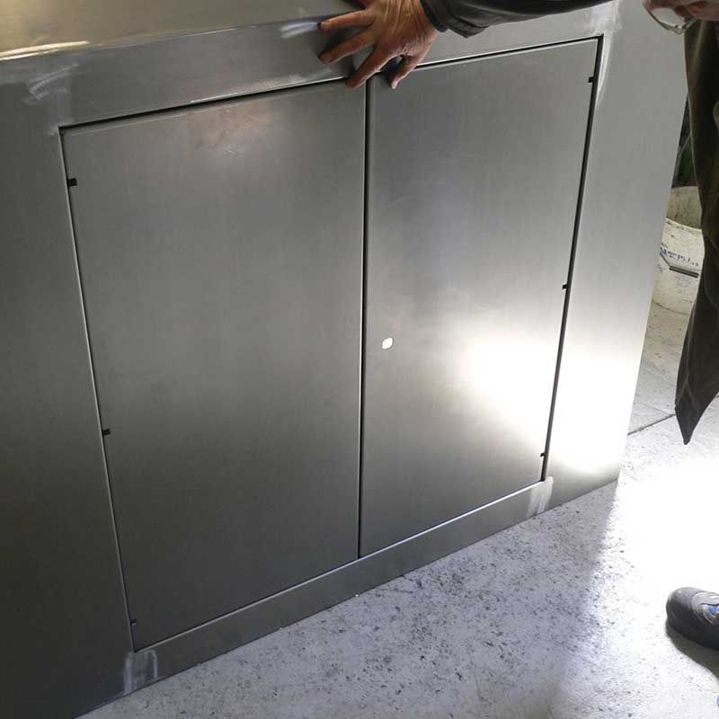 Komplette Maschineneinhausungen für Schleifmaschinen: Die Einhausung besteht wegen der Größe der Maschine aus verschiedenen Segmenten die mit dem Gussbett verschraubt werden. Das mittlere Segment bekommt zwei Schiebetüren.